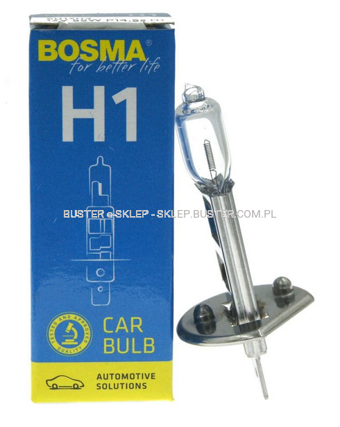 Wysokiej jakości, tania żarówka samochodowa H1 Bosma. Przeznaczona do świateł mijania i długich w pojazdach z instalacją elektryczną 12 V.