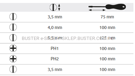 - Oznakowanie rodzaju grota na rękojeści ułatwia dobór odpowiedniego wkrętaka