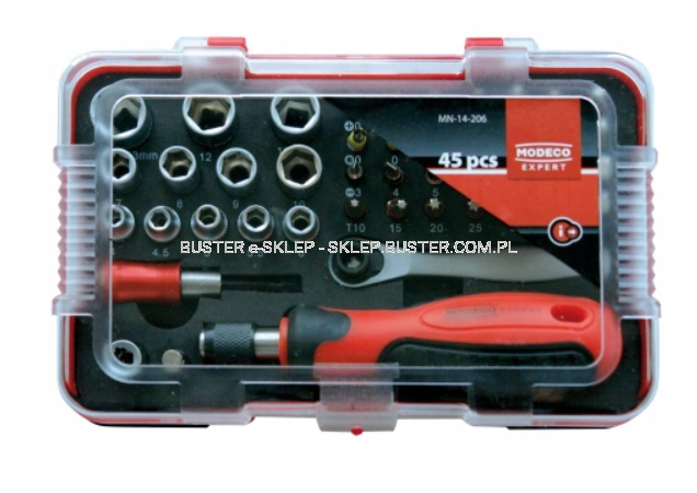 ZESTAW NARZĘDZI WKRĘTAK, NASADKI, GROTY 45 SZT MN-14-206 MODECO