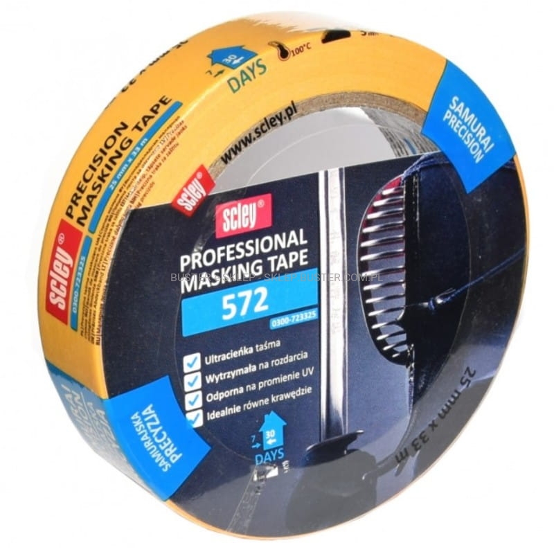 Precyzyjna taśma malarska 572 wykonana ze specjalnego, impregnowanego papieru ryżowego. Sprowadzany z Japonii papier ryżowy charakteryzuje się wyjątkową wytrzymałością na naprężenia mechaniczne. Jest bardzo cienki, dzięki czemu nie pozostawia odznaczeń pomiędzy malowanymi powierzchniami – to bardzo ważna cecha podczas malowania bardzo gładkich powierzchni oraz detali. Taśma jest odporna na wilgoć, dzięki tej właściwości może być stosowana również na zewnątrz pomieszczenia nawet do 5 dni. Specjalistyczny klej umożliwia pozostawienie taśmy na ścianach pomieszczeń nawet do miesiąca.