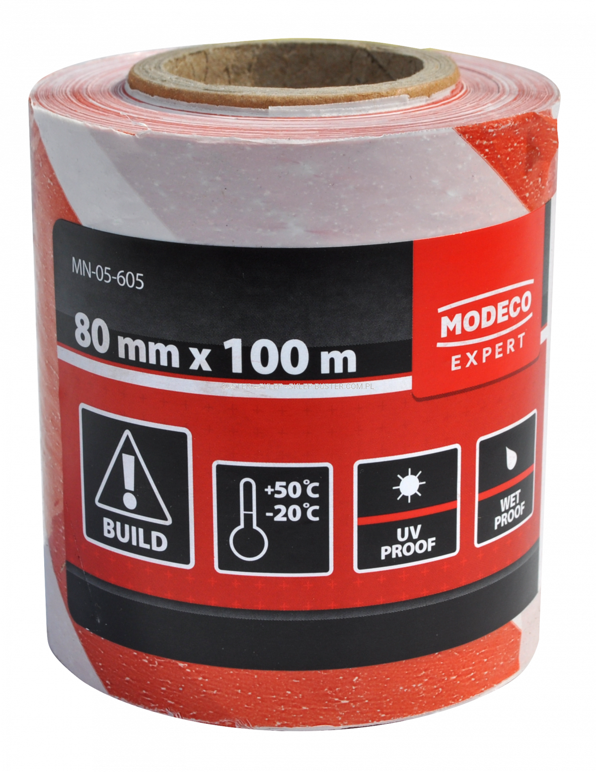Taśma ostrzegawcza biało-czerwona 75 mm x 100 m MODECO to taśma przeznaczona do wyraźnego oznaczania miejsc, gdzie wymagane jest zwrócenie uwagi na potencjalne zagrożenie, szczególnie podczas robót budowlanych. Dzięki swoim właściwościom jest wytrzymała i skuteczna w zastosowaniach zewnętrznych i wewnętrznych.