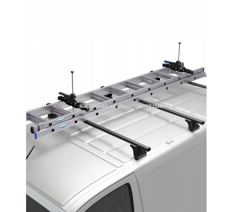 Zestaw uchwytów do mocowania drabin jedno- i wieloelementowych na bagażnikach samochodowych składający się z 2 zacisków do bezpiecznego mocowania drabiny oraz zamków do zabezpieczania przed kradzieżą.