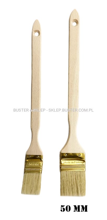 Pędzel kaloryferowy o szerokości 50mm z naturalnego włosia. Przeznaczony do prac malarskich. Do wszystkich rodzajów farb oraz impregnatów. Drewniany trzonek i skuwka wykonana z blachy stalowej zapewnia dużą trwałość pędzla. Specjalnie wyprofilowany i wydłużony trzonek pędzla umożliwia malowanie w miejscach trudno dostępnych.