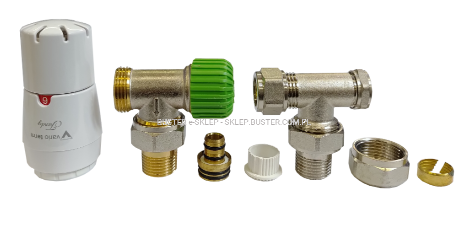 Zestaw instalacyjny „Standard” wersja kątowa do instalacji pex. Zawory termostatyczny oraz odcinający GW ½” / GZ ½”. Głowica termostatyczna "Trendy" GS.05-106C (Gwint: M30x1,5).