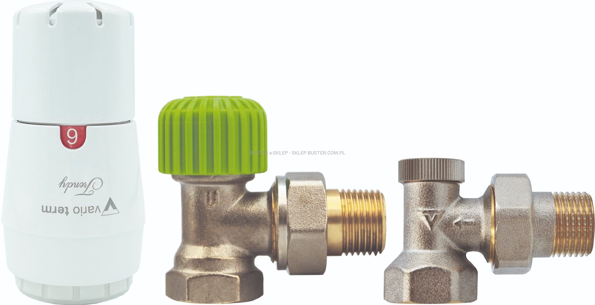 Zestaw instalacyjny „Standard” wersja kątowa. Zawory termostatyczny oraz odcinający GW ½” / GZ ½”. Głowica termostatyczna "Trendy" GS.05-106C (Gwint: M30x1,5).